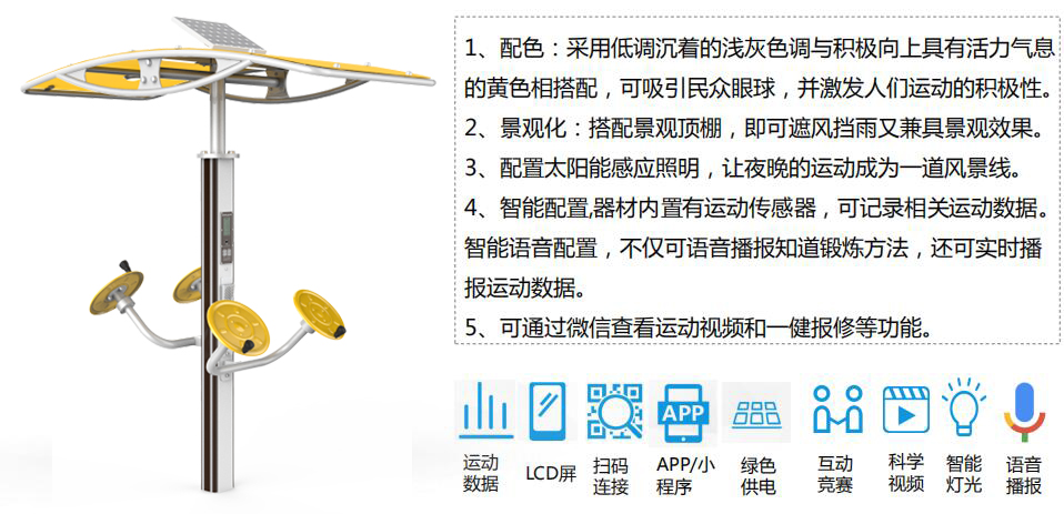 开元全民健身产品涵盖健身路径、运动场馆、篮乒气羽排等产品,分为多个系列,先进的制造工艺、严苛的质量检测,确保产品性能优良、品质安全可靠,让运动简单科学。并将全民健身器材(户外路径器材、体育场馆等产品)进行智能化升级和互联,实现全人群覆盖、全场景智能,让运动赞美生活。