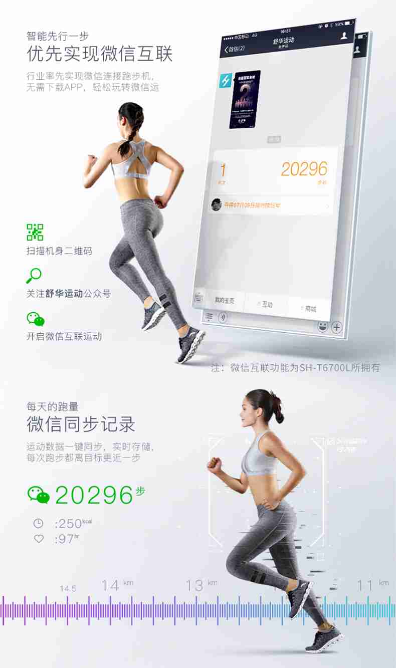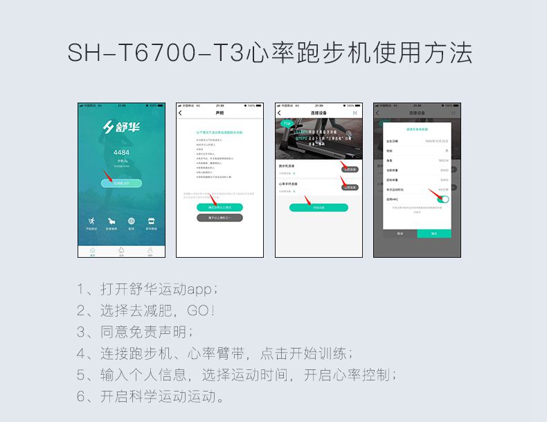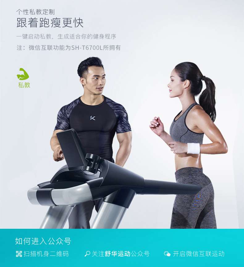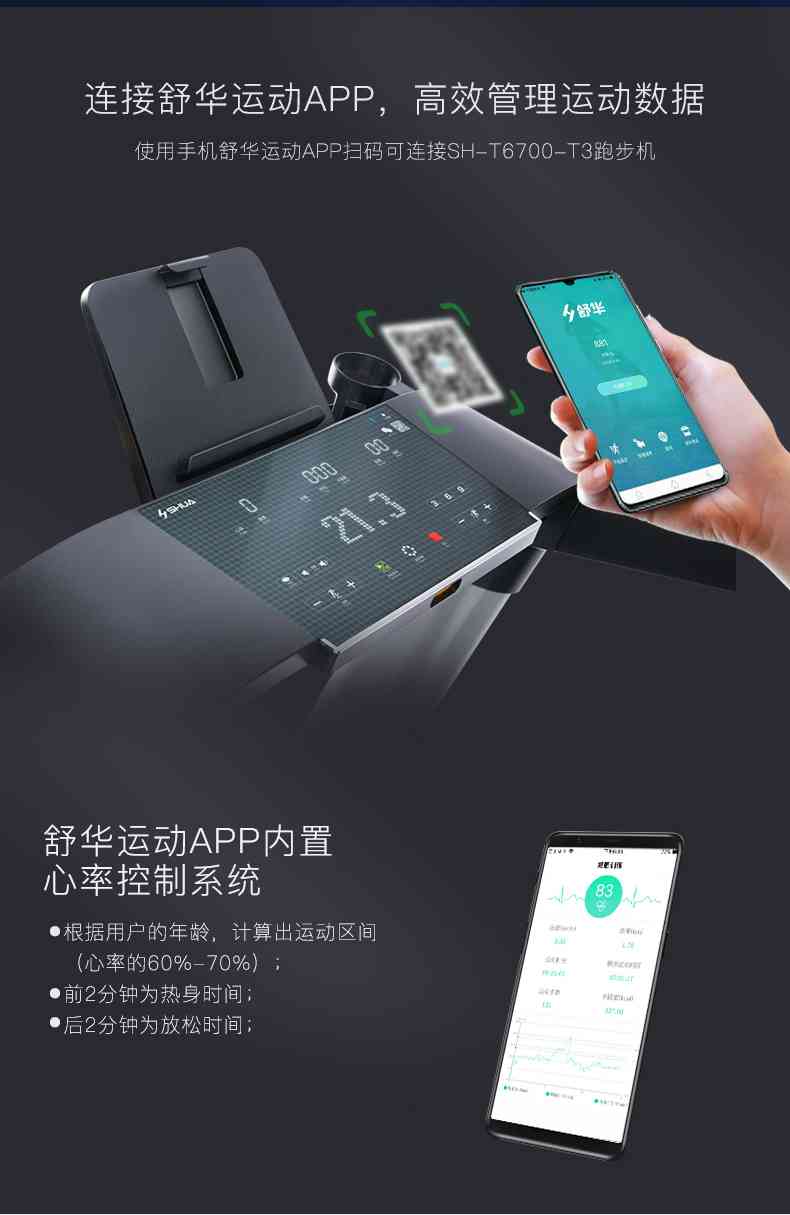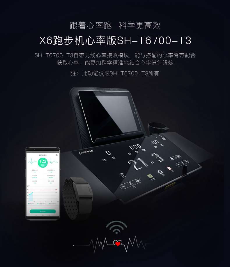 SH-T6700-T3跑步机为了帮助用户进行更加科学有效的运动,搭载开元APP连接心率臂带实现心率控制,通过监测运动心率从而实现科学运动。