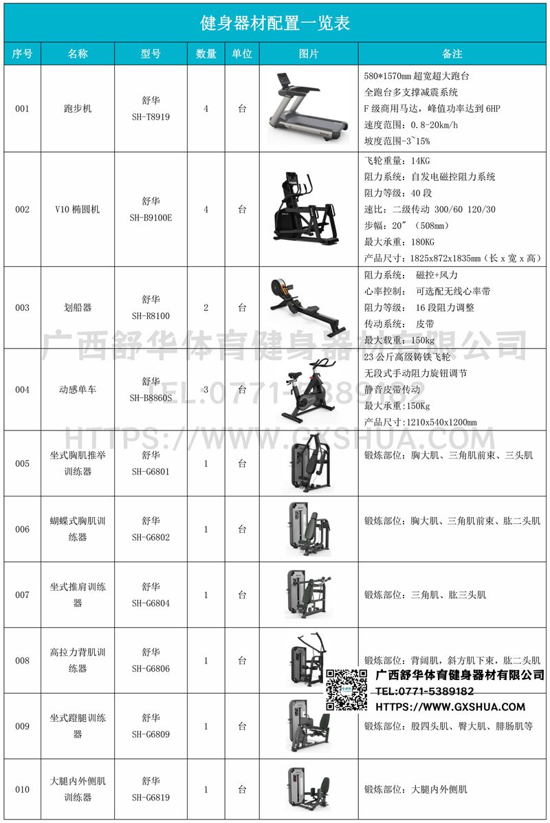 1.开元V9跑步机SH-T8919*4台-580*1570mm超宽超大跑台-跑感舒适,跑台整体安全稳定;全跑台多支撑减震平台,保证跑台超强支撑力,达到180kg支撑,满足专业健身房需求。F级商用马达-超强马达,AC 3.0HP 交流,峰值功率达到6HP,F级商用品质。速度范围达到0.8-20km/h;V9跑步机可实现跑台扬升功能,坡度范围-3~15%,满足客户不同的锻炼需求。