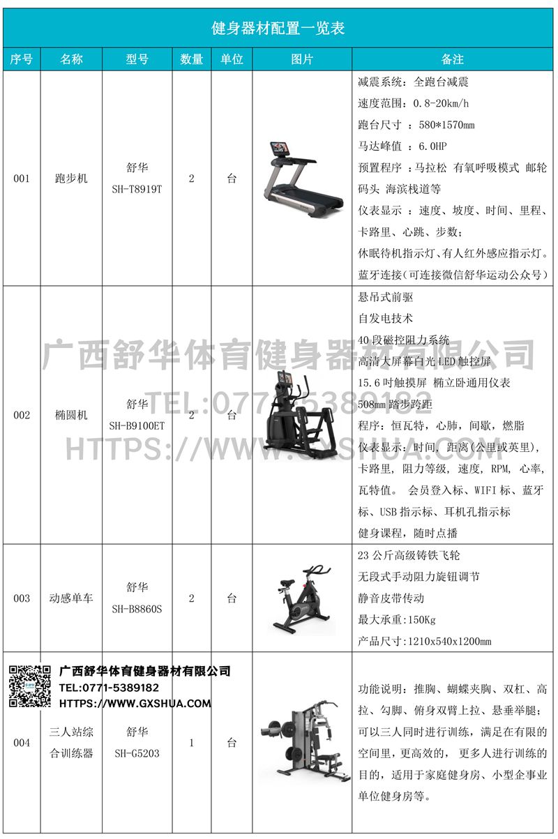 1.开元V9跑步机SH-T8919T*2台-V9+采用全跑台减震设计,为跑者提供舒适的落脚地感和稳定的跑步支撑,良好的缓冲防护,降低膝关节受伤风险。商用大跑台,为跑者提供从容奔跑空间,180kg承载力,580*1570纯跑台面积,满足专业健身需求。V9+采用F级商用马达,6HP峰值马力,20km/h最高速度,提供源源不断的动力。V9+内置健身直播软件,每周提供直播课程,内含大量专业线上健身点播课程,可为健身房不同人群提供多样化健身课程服务。
