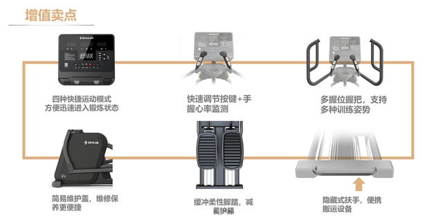 安全稳重,细节制胜。开元V8椭圆机是一款高安全系数的椭圆机,整体设计遵循人体工学科学,缓震踏板中添加减震层设计,能够有效减少运动冲击带来的关节损伤,且最大支持160kg载重,满足更多人群。手握心率监测、多功能置物架、自发电系统取代统电源......在细节上,新款椭圆机站在健身者角度,添加了不少设计者的巧思,为健身者带来更贴心的体验。