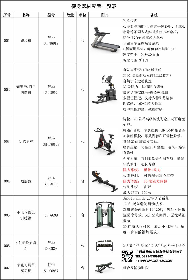 1.开元V9智能跑步机SH-T8919*1台-独立仪表-简洁大气,全新外观设计,健康运动新选择;心率监测功能,可通过手握心率、无线心率带等不同方式实时采集心率数据;580*1570mm超宽超大跑台-跑感舒适,跑台整体安全稳定;全跑台多支撑减震平台,保证跑台超强支撑力,达到180kg支撑,满足专业健身房需求。F级商用马达-超强马达,AC 3.0HP 交流,峰值功率达到6HP,F级商用品质。速度范围达到0.8-20km/h;V9跑步机可实现跑台扬升功能,坡度范围-3~15%,满足客户不同的锻炼需求。