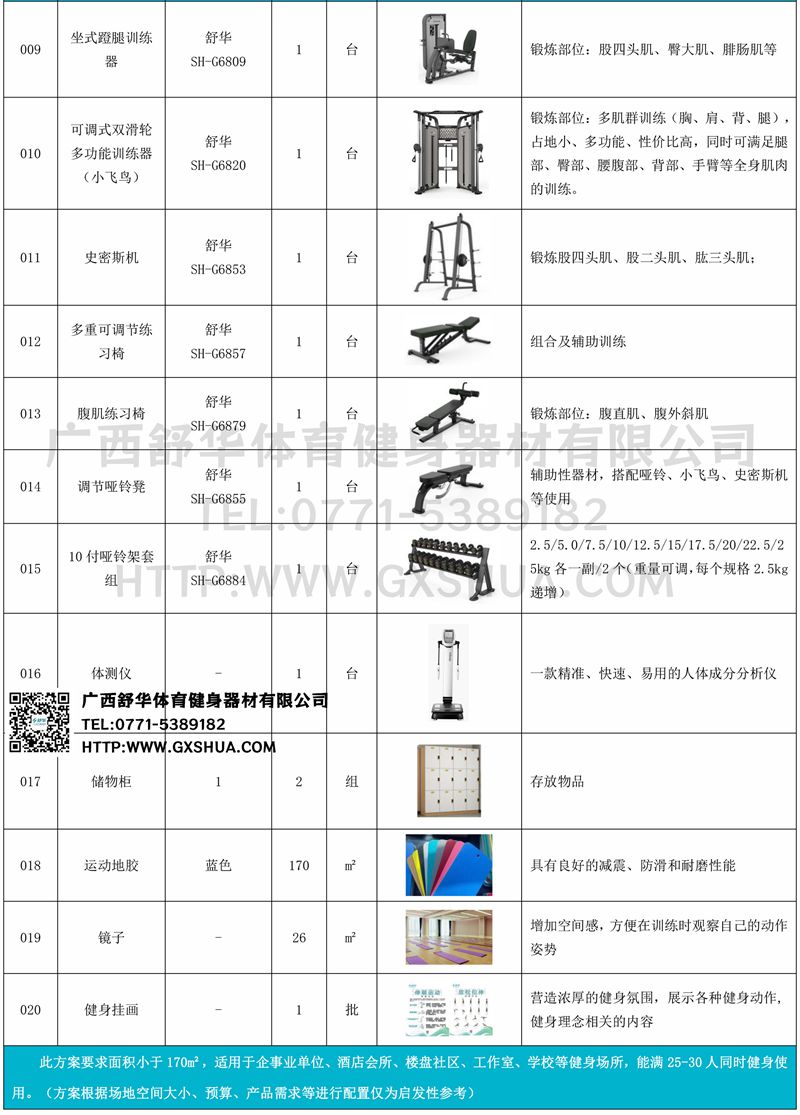 此方案要求面积小于170m²,适用于企事业单位、酒店会所、楼盘社区、工作室、学校等健身场所,能满25-30人同时健身使用。(方案根据场地空间大小、预算、产品需求等进行配置仅为启发性参考)