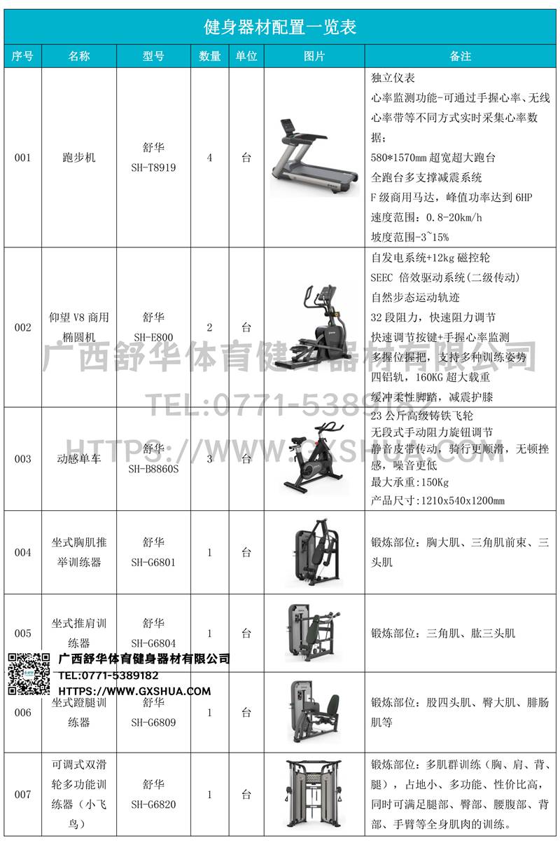 1.开元V9跑步机SH-T8919*4台-独立仪表-简洁大气,全新外观设计,健康运动新选择;心率监测功能,可通过手握心率、无线心率带等不同方式实时采集心率数据;580*1570mm超宽超大跑台-跑感舒适,跑台整体安全稳定;全跑台多支撑减震平台,保证跑台超强支撑力,达到180kg支撑,满足专业健身房需求。F级商用马达-超强马达,AC 3.0HP 交流,峰值功率达到6HP,F级商用品质。速度范围达到0.8-20km/h;V9跑步机可实现跑台扬升功能,坡度范围-3~15%,满足不同的锻炼需求。