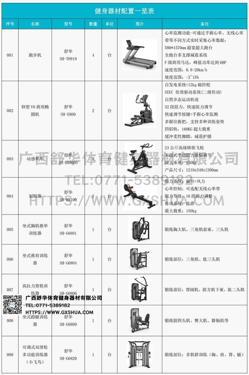 1.开元V9跑步机SH-T8919*4台-580*1570mm超宽超大跑台,全跑台多支撑减震平台,保证跑台超强支撑力,达到180kg支撑,满足专业健身房需求。F级商用马达-超强马达,AC 3.0HP 交流,峰值功率达到6HP,F级商用品质。速度范围达到0.8-20km/h;V9跑步机可实现跑台扬升功能,坡度范围-3~15%,满足客户不同的锻炼需求。