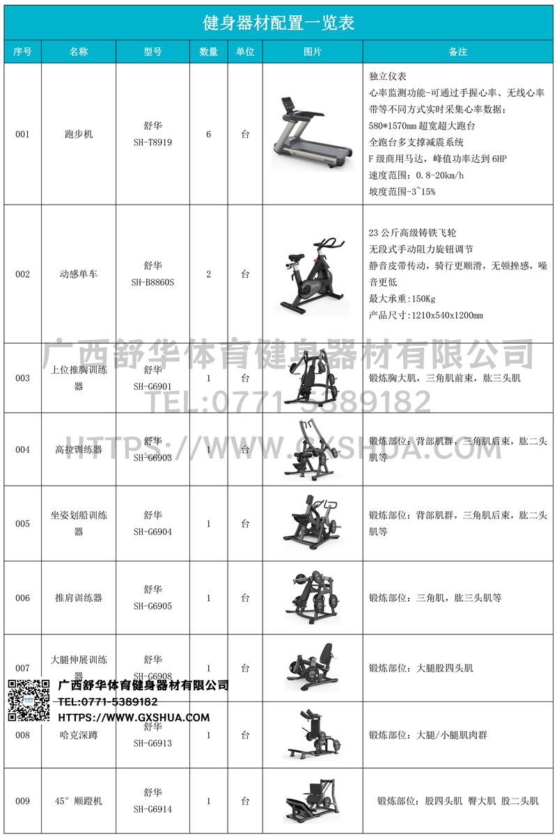 1.开元V9跑步机SH-T8919*6台-580*1570mm超宽超大跑台-跑感舒适,跑台整体安全稳定;全跑台多支撑减震平台,保证跑台超强支撑力,达到180kg支撑,满足专业健身房需求。F级商用马达-超强马达,AC 3.0HP 交流,峰值功率达到6HP,F级商用品质。速度范围达到0.8-20km/h;V9跑步机可实现跑台扬升功能,坡度范围-3~15%,满足客户不同的锻炼需求。